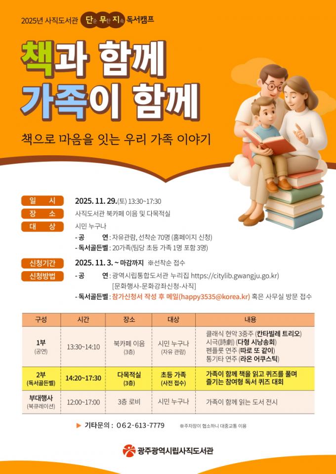 Âü°¡ ½ÅûÀº ½Ã¹Î ´©±¸³ª ÇÒ ¼ö ÀÖÀ¸¸ç, ±¤ÁÖ±¤¿ª½Ã¸³ÅëÇÕµµ¼°ü ´©¸®Áý(https://citylib.gwangju.go.kr)ÀÇ ¹®ÈÇà»ç¡æ¹®È°Á ½Åû¡æ»çÁ÷µµ¼°ü ¸Þ´º¿¡¼ ÇÏ¸é µÈ´Ù. ¡®µ¶¼°ñµçº§¡¯ Âü¿©¸¦ Èñ¸ÁÇÏ´Â °¡Á·Àº Âü°¡½Åû¼¸¦ ÀüÀÚ¿ìÆï(happy3535@korea.kr) ¶Ç´Â »çÁ÷µµ¼°ü »ç¹«½Ç·Î ¹æ¹®ÇØ ½ÅûÇÏ¸é µÈ´Ù. ÀÚ¼¼ÇÑ »çÇ×Àº µµ¼°ü ´©¸®ÁýÀ» Âü°íÇÏ¸é µÈ´Ù.