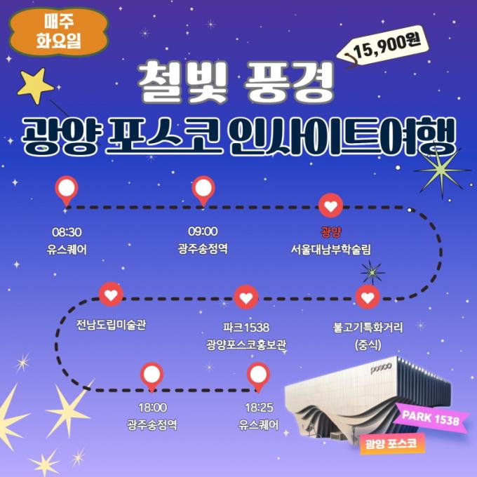 Åõ¾î´Â À¯½ºÄù¾î(08:30) Ãâ¹ß ¡æ ±¤ÁÖ¼ÛÁ¤¿ª(09:00) ¡æ ¼¿ï´ë ³²ºÎÇмú¸² ¡æ ±¤¾çºÒ°í±âƯȰŸ®(Áß½Ä) ¡æ Æ÷½ºÄÚÈ«º¸°ü Park1538 ¡æ Àü³²µµ¸³¹Ì¼ú°ü ¡æ ¼ÛÁ¤¿ª(18:00) ¡æ À¯½ºÄù¾î(18:25) ¼øÀ¸·Î ÁøÇàµÈ´Ù.