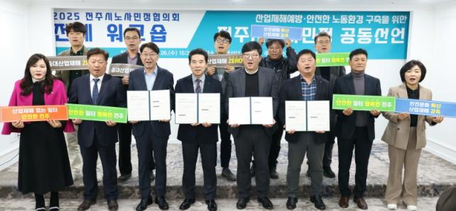 ¿öÅ©¼óÀÇ Ã¹ ¼ø¼´Â ¡®»ê¾÷ÀçÇØ ¾ø´Â ÀüÁÖ ½ÇÇö¡¯À» ¸ñÇ¥·Î ³»°Ç ³ë»ç¹ÎÁ¤ °øµ¿¼±¾ðÀ¸·Î Âü¼®ÀÚµéÀº ¡â¾ÈÀüº¸°Ç ±³À° Âü¿© ¡â¹ý·É Áؼö ¡âÁö¿ª»çȸ Âü¿© È®´ë ¡âÁ¤Ã¥ Áö¿ø °È µî °¢ ÁÖüÀÇ Ã¥¹«¸¦ ÇÔ²² ¼±¾ðÇϸç, »ê¾÷ÀçÇØ ¿¹¹æÀ» ÀüÁÖ½ÃÀÇ ÇÙ½É °¡Ä¡·Î »ï¾Æ 2026³â ¾ÈÀüÇÑ ³ëµ¿È¯°æ Á¶¼ºÀ» ¹Ýµå½Ã ´Þ¼ºÇϰڴٴ °øµ¿ ÀÇÁö¸¦ ¹àÇû´Ù.