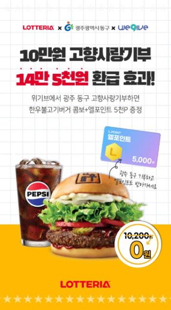 ±¤ÁÖ µ¿±¸¿¡ 10¸¸ ¿øÀ» ±âºÎÇÑ Âü¿©ÀÚ´Â ¡ã10¸¸ ¿ø ¿¬¸»Á¤»ê 100% ¼¼¾×°øÁ¦ ¡ã±¤ÁÖ µ¿±¸ ´ä·Êǰ(±âºÎ¾×ÀÇ 30% Çѵµ) Á¦°ø ¿Ü¿¡µµ, ·Ôµ¥¸®¾Æ ¡®ÇÑ¿ì ºÒ°í±â ¹ö°Å ÄÞº¸¡¯ ÄíÆù 1¸Å¿Í ¿¤Æ÷ÀÎÆ® 5õ Æ÷ÀÎÆ®¸¦ Ãß°¡·Î ¹ÞÀ» ¼ö ÀÖ´Ù. ±âºÎÀÚ°¡ ½ÇÁ¦·Î ¹ÞÀ» ¼ö ÀÖ´Â Àüü ÇýÅà ±Ô¸ð´Â 14¸¸ 5õ ¿ø »ó´çÀ¸·Î, ÄíÆù°ú ¿¤Æ÷ÀÎÆ®´Â ¸ÅÁÖ ¸ñ¿äÀÏ ¼øÂ÷ÀûÀ¸·Î ¹ß¼ÛµÉ ¿¹Á¤ÀÌ´Ù.