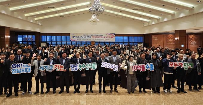 [È£³²´º½º¶óÀÎ = ¼ÀºÈ« ±âÀÚ] Àü¶ó³²µµ´Â 28ÀÏ ³²¾Ç ½ºÄ«ÀÌ¿þµùÄÁº¥¼Ç¿¡¼ ³ó¼ö»ê ¼öÃâ±â¾÷, ¼öÃâ À¯°ü±â°ü µî 200¿© ¸íÀÌ Âü¼®ÇÑ °¡¿îµ¥ ¡®2025 ³ó¼ö»ê½Äǰ ¼öÃâ±â¾÷ ÀüÁø´ëȸ¡¯¸¦ ¿¾î 2026³â ¼öÃâ 10¾ï ´Þ·¯ ´Þ¼º °áÀǸ¦ ´ÙÁ³´Ù.