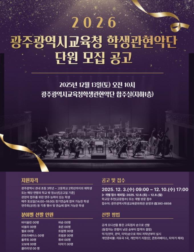 ±¤ÁÖ±¤¿ª½Ã±³À°Ã» Çлý°üÇö¾Ç´ÜÀº ÇлýµéÀÇ À½¾ÇÀû ±â·®°ú °¨¼ö¼ºÀ» Ű¿ì±â À§ÇØ ¿î¿µµÇ°í ÀÖ´Ù. ¸ÅÁÖ Åä¿äÀÏ ÇÕÁÖ¿¬½À°ú ¿¬ÁÖȸ, ±âȹ°ø¿¬ Âü¿© µî ´Ù¾çÇÑ À½¾Ç Ȱµ¿À» ÆîÄ£´Ù. ¸ðÁý ´ë»óÀº ±¤ÁÖÁö¿ª ÃʵîÇб³ 3Çгâ~°íµîÇб³ 2Çгâ Çлý, °°Àº ¿¬·É´ë Çб³ ¹Û û¼Ò³â µîÀÌ´Ù.