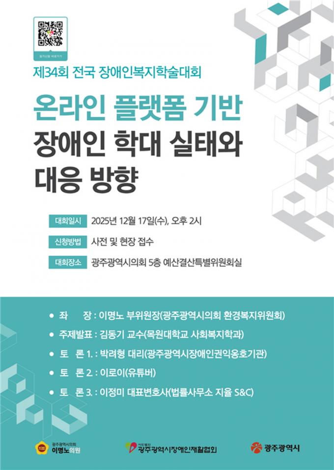 [È£³²´º½º¶óÀÎ = ¼ÀºÈ« ±âÀÚ] (»ç)±¤ÁÖ±¤¿ª½ÃÀå¾ÖÀÎÀçȰÇùȸ(ȸÀå ³ªÁ¾¸¸)´Â ¿À´Â 12¿ù 17ÀÏ ±¤ÁÖ±¤¿ª½ÃÀÇȸ 5Ãþ ¿¹»ê°á»êƯº°À§¿øÈ¸½Ç¿¡¼ ¡®Á¦34ȸ Àü±¹ Àå¾ÖÀκ¹ÁöÇмú´ëȸ¡¯¸¦ °³ÃÖÇÑ´Ù°í ¹àÇû´Ù.