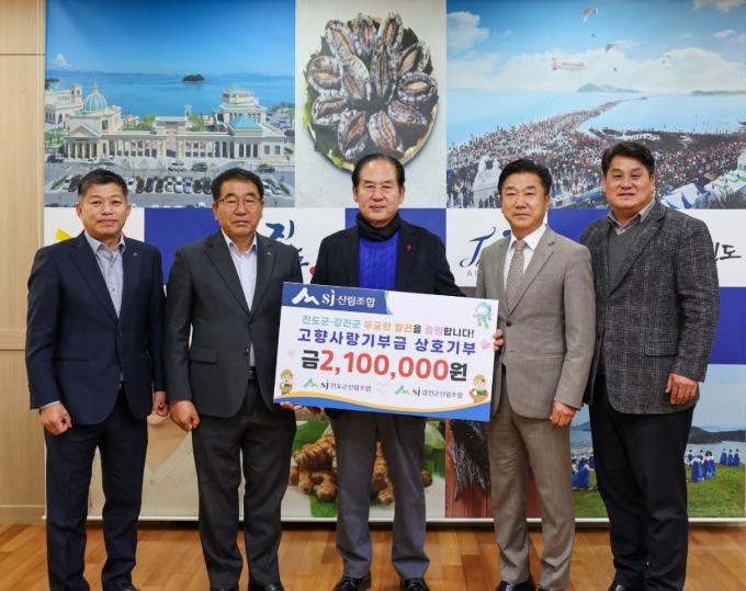[È£³²´º½º¶óÀÎ = ¼ÀºÈ« ±âÀÚ] °Áø±º»ê¸²Á¶ÇÕ°ú Áøµµ±º»ê¸²Á¶ÇÕ ÀÓÁ÷¿øµéÀÌ Áö³ 11ÀÏ Áøµµ±ºÃ»¿¡¼ °íÇâ»ç¶û±âºÎ±Ý 210¸¸¿øÀ» »óÈ£ Áö¿ª¿¡ ±âºÎÇß´Ù.