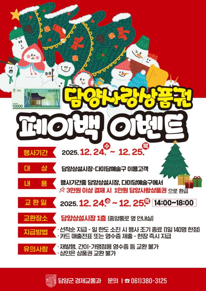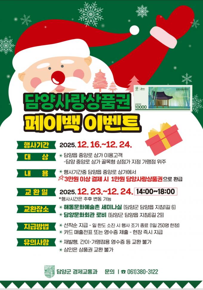[È£³²´º½º¶óÀÎ = ¼ÀºÈ« ±âÀÚ] ´ã¾ç±º(±º¼ö Á¤Ã¶¿ø)Àº ¿¬¸» ¼Òºñ ÁøÀÛ°ú Áö¿ª »ó±Ç Ȱ¼ºÈ¸¦ À§ÇØ 12¿ù 23ÀϺÎÅÍ 25ÀϱîÁö ´ã¾çÀ¾ Áß¾Ó·Î¿Í ´ã¾ç½ÃÀå ÀÏ¿ø¿¡¼ ¡®´ã¾ç»ç¶û»óǰ±Ç ÆäÀ̹é Çà»ç¡¯¸¦ ¿î¿µÇÑ´Ù.