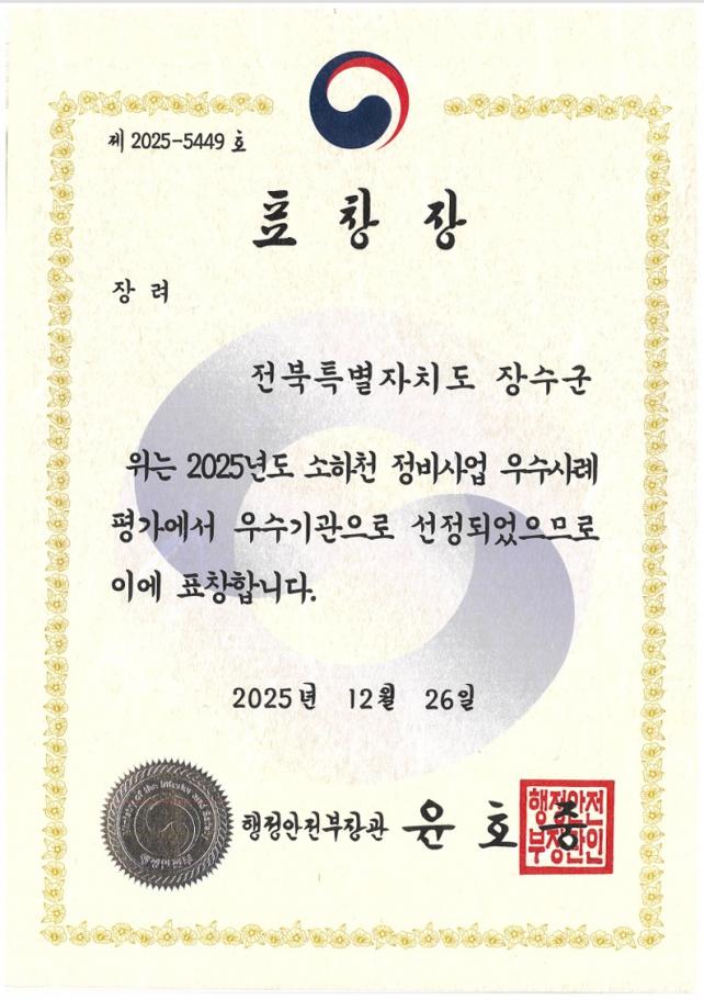 [È£³²´º½º¶óÀÎ = ¼ÀºÈ« ±âÀÚ] Àå¼ö±ºÀº ÇàÁ¤¾ÈÀüºÎ ÁÖ°ü¡®2025³â ¼ÒÇÏõ Á¤ºñ»ç¾÷ ¿ì¼ö»ç·Ê °ø¸ð¡¯¿¡¼ 'Àå·Á»ó' À» ¼ö»óÇÏ´Â Äè°Å¸¦ °Åµ×´Ù.