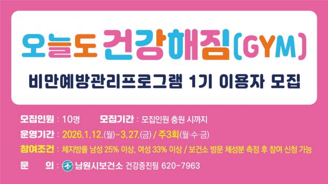 [È£³²´º½º¶óÀÎ = ÃÖÀç¼± ±âÀÚ] ³²¿ø½Ãº¸°Ç¼Ò(¼ÒÀå ÇÑ¿ëÀç)°¡ Áö¿ªÁÖ¹ÎÀÇ ºñ¸¸À²À» ³·Ãß°í °Ç°ÇÑ »ýȰ½À°ü Çü¼ºÀ» À§ÇÑ ºñ¸¸¿¹¹æ°ü¸® ÇÁ·Î±×·¥ ¡¸¿À´Ãµµ °Ç°ÇØÁü(GYM)¡¹ 1±â ÀÌ¿ëÀÚ¸¦ ¸ðÁýÇÑ´Ù.