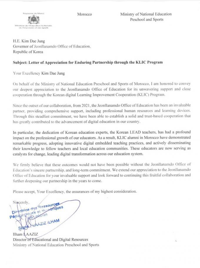 À̹ø °¨»ç ¼ÇÑÀº Àü¶ó³²µµ±³À°Ã»ÀÌ 2021³âºÎÅÍ ±³À° Á¤º¸È Áö¿ø »ç¾÷ (KLIC‧Korean Digital-Learning Improvement Cooperation)À» ÅëÇØ ¸ð·ÎÄÚ ±³À°ºÎ¿Í µðÁöÅÐ ±³À° ºÐ¾ß¿¡¼ Áö¼ÓÀûÀÎ Çù·ÂÀ» À̾î¿Â µ¥ ´ëÇÑ Æò°¡¸¦ ´ã°í ÀÖ´Ù.
