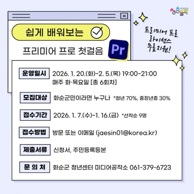 ½Åû ÀÚ°ÝÀº ȼø±º¹ÎÀÌ¸é ´©±¸³ª °¡´ÉÇϸç, ¼±¹ß ÀοøÀÇ 70%´Â û³âÃþÀ» ¿ì¼± ¼±¹ßÇϰí, ³ª¸ÓÁö 30%´Â ÁßÀå³âÃþÀ» ¼±¹ßÇÒ ¿¹Á¤ÀÌ´Ù. ½ÅûÀº ½Åû¼¿Í ÇÔ²² Áֹεî·Ïµîº»À» Á¦ÃâÇØ¾ß Çϸç, 1¿ù 16ÀϱîÁö ȼø±º û³â¼¾Å͸¦ ¹æ¹®Çϰųª °ø½Ä ȨÆäÀÌÁö(https://www.hwasun.go.kr/youth)¸¦ ÅëÇØ ½ÅûÇÏ¸é µÈ´Ù.