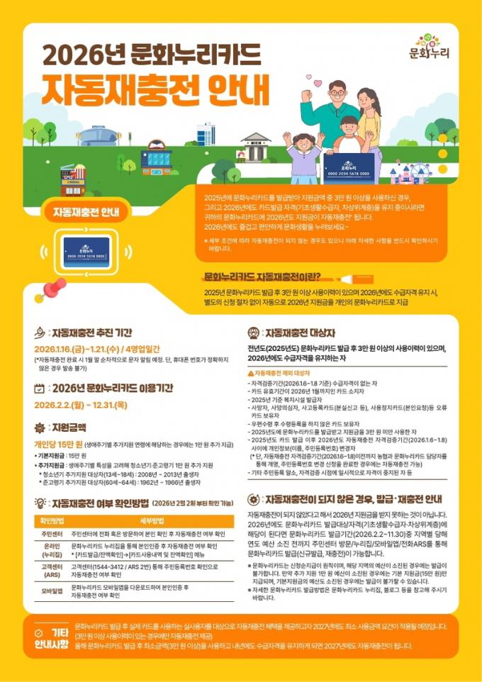 [È£³²´º½º¶óÀÎ = ¼ÀºÈ« ±âÀÚ] ¹«¾È±º(±º¼ö ±è»ê)Àº ¹®È´©¸®Ä«µå(ÅëÇÕ¹®ÈÀÌ¿ë±Ç) ÀÌ¿ëÀÚ °¡¿îµ¥ ¼ö±Þ ÀÚ°ÝÀ» À¯ÁöÇÑ ´ë»óÀÚ¿¡°Ô º°µµÀÇ ½Åû ÀýÂ÷ ¾øÀÌ 2026³âµµ Áö¿ø±ÝÀ» ÀÚµ¿À¸·Î ÃæÀüÇØ ÁÖ´Â ¡®ÀÚµ¿ ÀçÃæÀü Á¦µµ¡¯¸¦ ½ÃÇàÇÑ´Ù°í ¹àÇû´Ù.