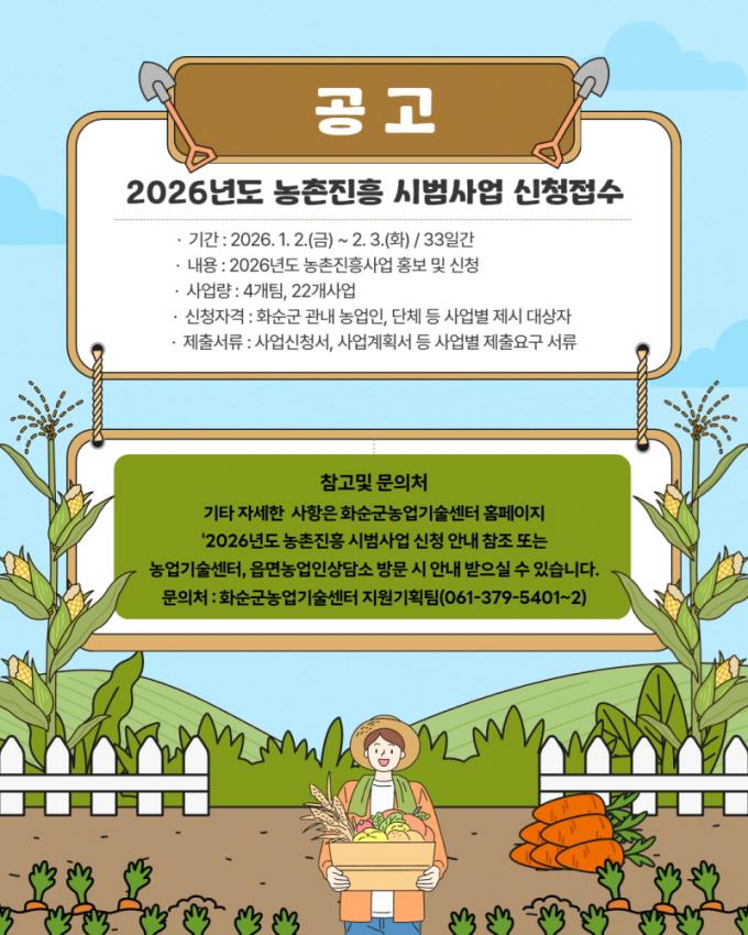 ÀÚ¼¼ÇÑ »ç¾÷ ³»¿ëÀº ȼø±ºÃ» ¹× ȼø±º³ó¾÷±â¼ú¼¾ÅÍ ´©¸®Áý¿¡ °Ô½ÃµÈ ¡®2026³â ³óÃÌÁøÈï ½Ã¹ü»ç¾÷ ½Åû °ø°í¡¯¸¦ ÅëÇÏ¿© È®ÀÎÇÒ ¼ö ÀÖÀ¸¸ç, »ç¾÷ ´ë»óÀÚ´Â ÇöÀå ½É»ç¿Í ³ó¾÷»êÇÐÇùµ¿½ÉÀÇȸ ½ÉÀÇ µîÀ» °ÅÃÄ ÃÖÁ¾ ¼±Á¤µÈ´Ù.
