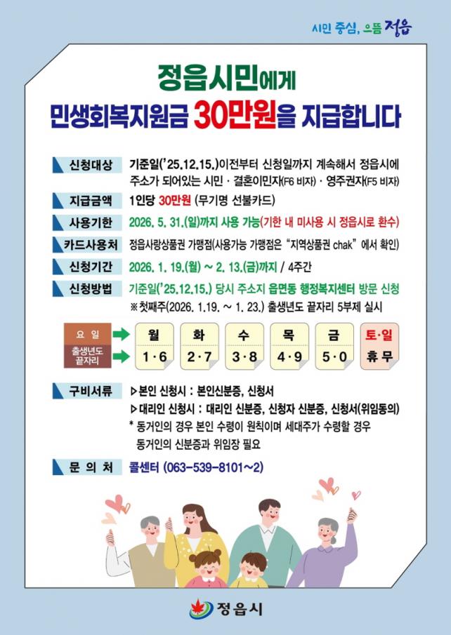 ½Åû ±â°£Àº ¿À´Â 19ÀϺÎÅÍ 2¿ù 13ÀϱîÁö 4ÁÖ°£ ÁøÇàµÈ´Ù. Áö¿ø±ÝÀ» ¹ÞÀ¸·Á´Â ½Ã¹ÎÀº 2025³â 12¿ù 15ÀÏ ±âÁØ ÁÖ¼ÒÁö °üÇÒ À¾¡¤¸é¡¤µ¿ ÇàÁ¤º¹Áö¼¾Å͸¦ ¹æ¹®ÇØ ½ÅûÇÏ¸é µÈ´Ù. º»ÀÎ ½Åû ½Ã ½ÅºÐÁõ°ú ½Åû¼¸¦ ÁöÂüÇØ¾ß Çϸç, ´ë¸®ÀÎÀÌ ¹æ¹®ÇÒ °æ¿ì À§ÀÓ µ¿ÀǼ¿Í À§ÀÓÀÚ ¹× ´ë¸®ÀÎÀÇ ½ÅºÐÁõÀ» ¸ðµÎ ì°Ü¾ß ÇÑ´Ù. 14¼¼ ÀÌÇÏ ¾Æµ¿ÀÇ Áö¿ø±ÝÀº ¹ýÁ¤´ë¸®ÀÎÀÌ ´ë½Å ¼ö·ÉÇÒ ¼ö ÀÖ´Ù.