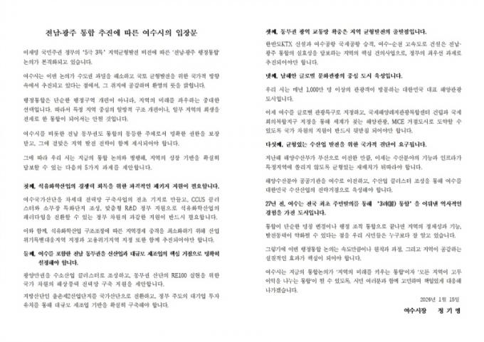 Á¤±â¸í ¿©¼ö½ÃÀåÀº ¡°¿©¼ö´Â °ú°Å Àü±¹ ÃÖÃÊ·Î ÁֹιßÀǸ¦ ÅëÇÑ ¡®3·Á ÅëÇÕ¡¯À» ÀÌ·ï³½ ÀÚÄ¡ ºÐ±ÇÀÇ »ó¡Àû µµ½Ã¡±¶ó¸ç ¡°À̹ø ÇàÁ¤ÅëÇÕÀÌ ¿©¼öÀÇ Á¤Ã¼¼ºÀ» ÁöŰ¸é¼µµ »õ·Î¿î µµ¾àÀÇ ±âȸ°¡ µÉ ¼ö ÀÖµµ·Ï ½Ã¹Îµé°ú ÇÔ²² Ä¡¹ÐÇÏ°Ô ´ëÀÀÇØ ³ª°¡°Ú´Ù¡±¶ó°í ¹àÇû´Ù.