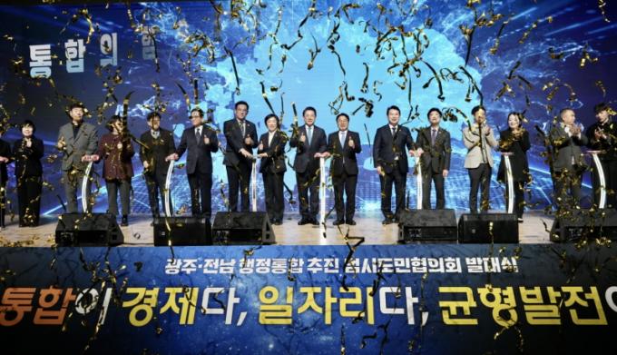 ±¤ÁÖ±¤¿ª½Ã(½ÃÀå °±âÁ¤)¿Í Àü¶ó³²µµ(Áö»ç ±è¿µ·Ï)´Â 16ÀÏ ¿ÀÈÄ 3½Ã ±è´ëÁßÄÁº¥¼Ç¼¾ÅÍ¿¡¼ ¡®±¤ÁÖ‧Àü³² ÇàÁ¤ÅëÇÕ ÃßÁø ¹ü½Ãµµ¹Î ÇùÀÇȸ¡¯ ¹ß´ë½ÄÀ» ¿°í, ´ëÇѹα¹ ÃÖÃÊÀÇ ÅëÇÕ ±¤¿ªÁö¹æÁ¤ºÎ ź»ýÀ» À§ÇÑ ½Ãµµ¹Î ¿ª·® °áÁý¿¡ ³ª¼¹´Ù.