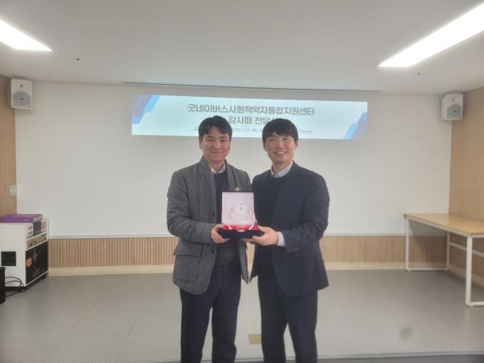 [È£³²´º½º¶óÀÎ = ¼ÀºÈ« ±âÀÚ] ±Â³×À̹ö½º»çȸÀû¾àÀÚÅëÇÕÁö¿ø¼¾ÅÍ(º»ºÎÀå °âÀÓ ¹èÁØ¿)´Â ±¤Á־Ƶ¿º¹ÁöÇùȸ(ȸÀå ÃÖ¸ð¼¼)·ÎºÎÅÍ Áö¿ª ³» »çȸÀû ¾àÀÚ Áö¿ø °ø·Î¸¦ ÀÎÁ¤¹Þ¾Æ °¨»çÆÐ¸¦ ¼ö¿©¹Þ´Â Àü´Þ½ÄÀ» 19ÀÏ(¿ù) ÁøÇàÇß´Ù°í ¹àÇû´Ù.