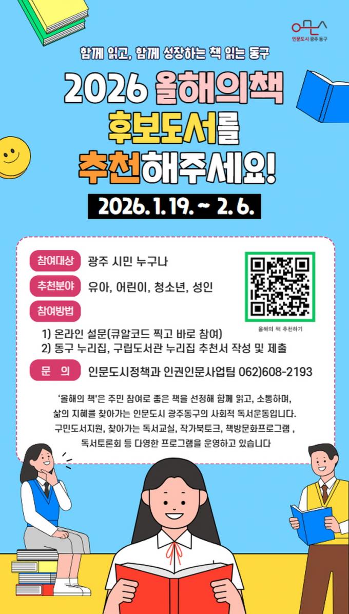 [È£³²´º½º¶óÀÎ = ¼ÀºÈ« ±âÀÚ] ±¤ÁÖ µ¿±¸´Â ÇÑ ÇØ µ¿¾È ½Ã¹Î°ú ÇÔ²² ÀÐÀ» 2026³â ¡®Ã¥ Àд µ¿±¸ ¿ÃÇØÀÇ Ã¥¡¯ ¼±Á¤À» À§ÇØ Èĺ¸ µµ¼ ÃßõÀ» ¿À´Â 2¿ù 6ÀϱîÁö Á¢¼öÇÑ´Ù°í ¹àÇû´Ù.