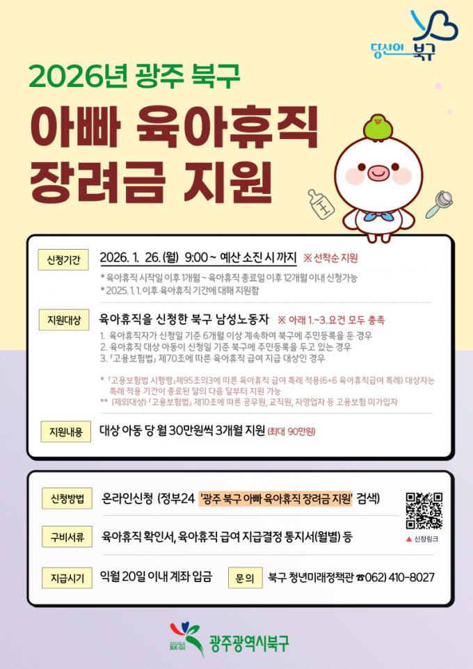 25ÀÏ ºÏ±¸¿¡ µû¸£¸é ¿À´Â 26ÀϺÎÅÍ ¡®2026³â ¾Æºü À°¾ÆÈÞÁ÷ Àå·Á±Ý¡¯ ½ÅûÀÌ ½ÃÀ۵ȴÙ. À̹ø »ç¾÷Àº ¾çÀ° Ä£È È¯°æÀ» Á¶¼ºÇϰí ÈÞÁ÷¿¡ µû¸¥ °æÁ¦Àû ºÎ´ãÀ» ¿ÏÈÇϱâ À§ÇØ Áö³ÇØ ºÏ±¸°¡ ±¤ÁÖ¿¡¼ óÀ½À¸·Î ½ÃÇàÇÑ À°¾Æ Áö¿ø Á¤Ã¥ÀÌ´Ù.