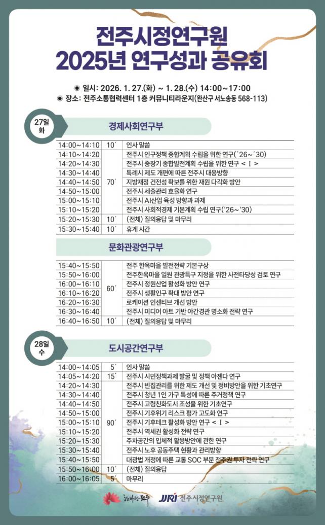 [È£³²´º½º¶óÀÎ = ¼ÀºÈ« ±âÀÚ] ÀüÁÖ½ÃÁ¤¿¬±¸¿ø(¿øÀå ¹Ú¹ÌÀÚ, ÀÌÇÏ ¿¬±¸¿ø)Àº °³¿ø 2ÁÖ³âÀ» ¸Â¾Æ 27, 28ÀÏ ¾çÀϰ£ ÀüÁֽà ÁÖ¿ä Á¤Ã¥ ¿¬±¸¼º°ú¸¦ °øÀ¯ÇÏ´Â ¡®2025³â ¿¬±¸¼º°ú °øÀ¯È¸¡¯¸¦ °³ÃÖÇÑ´Ù°í 26ÀÏ ¹àÇû´Ù.