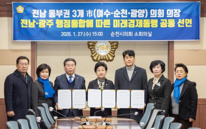 [È£³²´º½º¶óÀÎ = ¼ÀºÈ« ±âÀÚ] Àü¶ó³²µµ¿Í ±¤ÁÖ±¤¿ª½ÃÀÇ ÇàÁ¤±¸¿ª ÅëÇÕ ÃßÁøÀÌ ±Þ¹°»ìÀ» Ÿ°í ÀÖ´Â °¡¿îµ¥, ¿©¼ö½ÃÀÇȸ, ¼øÃµ½ÃÀÇȸ, ±¤¾ç½ÃÀÇȸ´Â 27ÀÏ Àü³²¡¤±¤ÁÖ ÇàÁ¤ÅëÇÕ¿¡ ´ëÀÀÇÏ¿© Àü³²µ¿ºÎ±ÇÀÇ °øµ¿¹ßÀü°ú À§»ó °È¸¦ À§ÇÑ ¹Ì·¡°æÁ¦µ¿¸Í °øµ¿¼±¾ð¹®À» ¹ßÇ¥Çß´Ù.