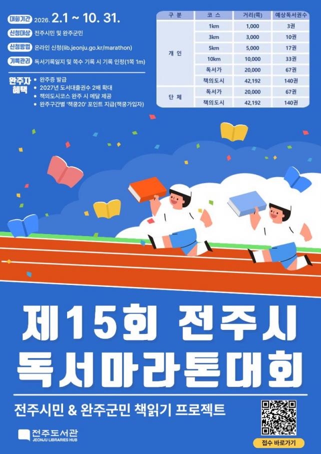 ÇÑÆí, Á¦15ȸ ÀüÁֽà µ¶¼¸¶¶óÅæ ´ëȸ´Â ¿À´Â 2¿ù 1ÀϺÎÅÍ ÀüÁÖµµ¼°ü ´©¸®Áý(lib.jeonju.go.kr/marathon)À» ÅëÇØ ½ÅûÇÒ ¼ö ÀÖÀ¸¸ç, ±âŸ ÀÚ¼¼ÇÑ »çÇ×Àº ÀüÈ(063-230-1811)·Î ¹®ÀÇÇÏ¸é µÈ´Ù.