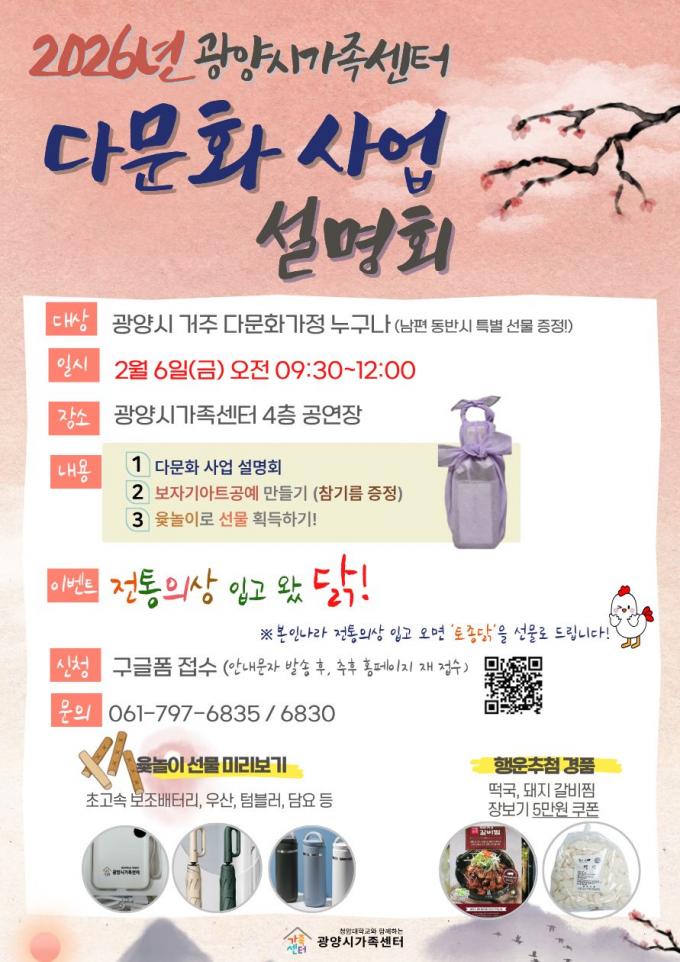 [È£³²´º½º¶óÀÎ = ¼ÀºÈ« ±âÀÚ] ±¤¾ç½Ã°¡Á·¼¾ÅÍ´Â 2026³â¿¡ ½ÃÇàÇÏ´Â ´Ù¹®È°¡Á· Áö¿ø»ç¾÷¿¡ ´ëÇÑ ÀÌÇØ¸¦ µ½±â À§ÇØ ¿À´Â 2¿ù 6ÀÏ(±Ý) ¿ÀÀü 9½Ã 30ºÐ, ±¤¾ç½Ã °¡Á·¹®È¼¾ÅÍ 4Ãþ °¡Á·°ø¿¬Àå¿¡¼ ¡®2026³â ´Ù¹®È»ç¾÷ ¼³¸íȸ¡¯¸¦ °³ÃÖÇÑ´Ù°í ¹àÇû´Ù.