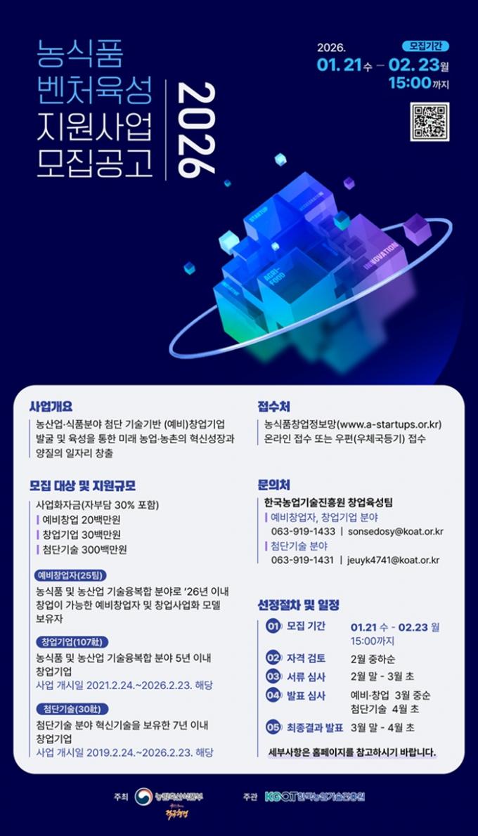 2026³â ³ó½Äǰ º¥Ã³À°¼º Áö¿ø»ç¾÷Àº ³ó½Äǰ ºÐ¾ß ¿¹ºñâ¾÷ÀÚ¿Í Ã¢¾÷ Ãʱ⠱â¾÷, ÷´Ü±â¼úÀ» Á¢¸ñÇÑ À¯¸Á º¥Ã³±â¾÷À» ´ë»óÀ¸·Î »ç¾÷È Àڱݰú ¼ºÀå Áö¿øÀ» Á¦°øÇÏ´Â »ç¾÷ÀÌ´Ù. ¿À´Â 23ÀϱîÁö ³ó½Äǰâ¾÷Á¤º¸¸Á(www.a-startups.or.kr)¿¡ Á¢¼öÇÏ¸é µÈ´Ù.