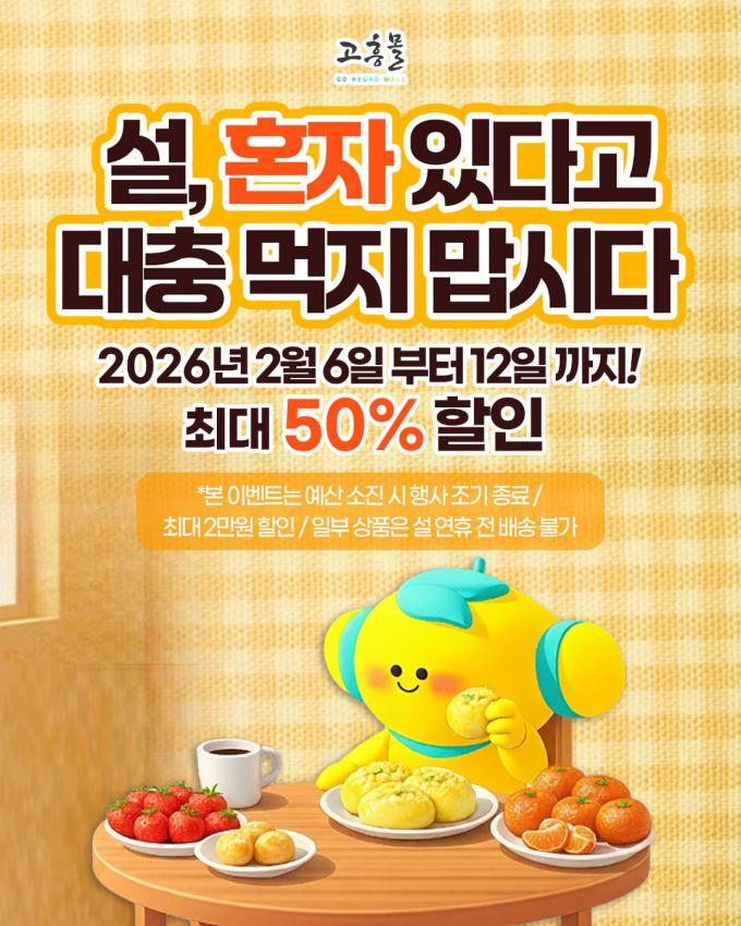 [È£³²´º½º¶óÀÎ = ¼ÀºÈ« ±âÀÚ] °íÈﱺ(±º¼ö °ø¿µ¹Î)ÀÌ ¿î¿µÇÏ´Â ¿Â¶óÀÎ ³ó¼öÃàÆ¯»ê¹° ¼îÇθô °íÈï¸ôÀº ¼³ ¿¬ÈÞ ±â°£ È¥ÀÚ ¸íÀýÀ» º¸³»´Â 1ÀÎ °¡±¸¿Í °£ÆíÇϸ鼵µ Á¦´ë·Î µÈ ½Ä»ç¸¦ ¿øÇÏ´Â ¼ÒºñÀÚ¸¦ À§ÇØ ¿À´Â 2¿ù 6ÀϺÎÅÍ 12ÀϱîÁö ¡®È¥ÀÚ ÀÖ´Ù°í ´ëÃæ ¸ÔÁö ¸¿½Ã´Ù¡¯ ±âȹÀüÀ» ¿î¿µÇÑ´Ù.
