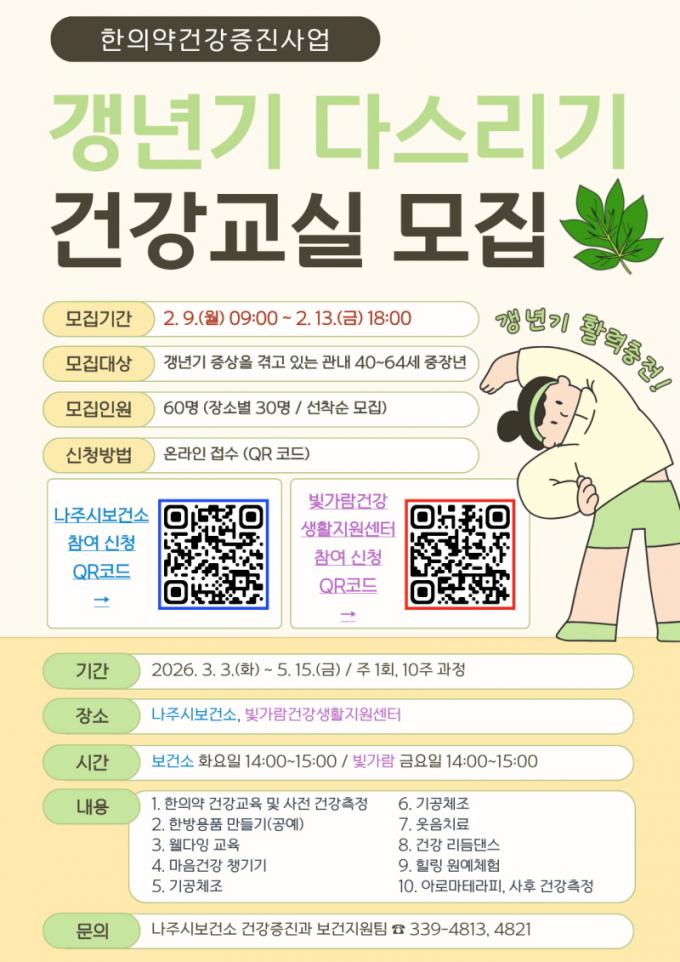 [È£³²´º½º¶óÀÎ = ¼ÀºÈ« ±âÀÚ] ³ªÁֽú¸°Ç¼Ò°¡ °»³â±â Áõ»óÀ» °Þ°í ÀÖ´Â ÁßÀå³âÀÇ °Ç° ÁõÁøÀ» À§ÇØ ¡®2026³â »ó¹Ý±â °»³â±â ´Ù½º¸®±â °Ç°±³½Ç¡¯ Âü¿©ÀÚ¸¦ ¸ðÁýÇÑ´Ù.