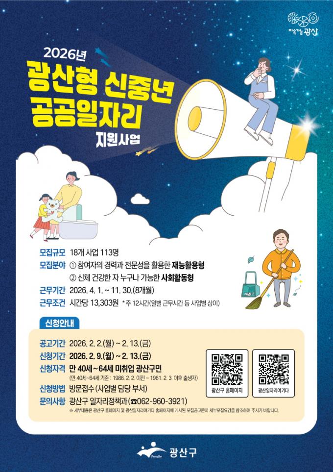 ±¤»ê±¸´Â 2°³ ºÐ¾ß 18°³ »ç¾÷¿¡¼ 8°³¿ù°£ Ȱµ¿ÇÒ 113¸íÀÇ Âü¿©ÀÚ¸¦ ¸ðÁýÇÑ´Ù. ½Åû ±â°£Àº 9ÀϺÎÅÍ 13ÀϱîÁö °¢ ÀÏÀÚ¸® ´ã´ç ºÎ¼¿¡ ¹æ¹®ÇÏ¸é µÇ¸ç, °ø°øÀÏÀÚ¸® °ü·ÃÇÑ ÀÚ¼¼ÇÑ »çÇ×Àº ±¤»ê±¸ ´©¸®ÁýÀ̳ª ±¤»ê±¸ ÀÏÀÚ¸® ÅëÇÕÇ÷§Æû(±¤»ê ÀÏÀÚ¸® ¿©±â´Ù) ´©¸®Áý¿¡¼ È®ÀÎÇÒ ¼ö ÀÖ´Ù.