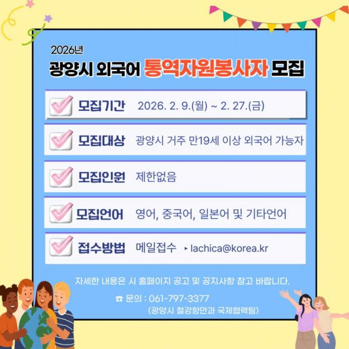 [È£³²´º½º¶óÀÎ = ¼ÀºÈ« ±âÀÚ] ±¤¾ç½Ã´Â °¢Á¾ ÃàÁ¦¿Í ±¹Á¦Çà»ç¿¡¼ÀÇ Å뿪 Áö¿ø°ú ¿Ü±¹ÀÎ ¹Î¿ø ¾È³» µî ´Ù¾çÇÑ ºÐ¾ß¿¡¼ Å뿪 ºÀ»ç¿¡ Âü¿©ÇÒ ½Ã¹Î ¿Ü±¹¾î Å뿪ÀÚ¿øºÀ»çÀÚ¸¦ 2¿ù 9ÀϺÎÅÍ 2¿ù 27ÀϱîÁö ¸ðÁýÇÑ´Ù°í ¹àÇû´Ù.