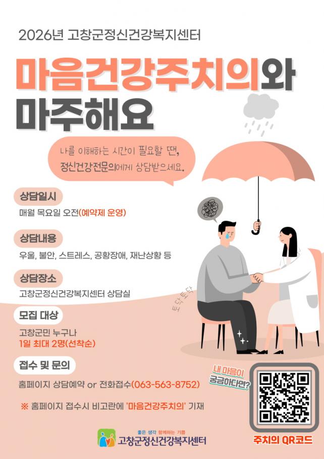 [È£³²´º½º¶óÀÎ = ¼ÀºÈ« ±âÀÚ] °íⱺ Á¤½Å°Ç°º¹Áö¼¾ÅͰ¡ Áö¿ªÁÖ¹ÎÀÇ ¸¶À½ °Ç° ÁõÁøÀ» À§ÇØ 2026³â ¸¶À½°Ç°ÁÖÄ¡ÀÇ »ç¾÷À» ¿î¿µÇϰí ÀÖ´Ù.