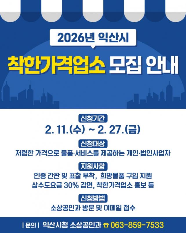 Âü¿©¸¦ Èñ¸ÁÇÏ´Â ¾÷¼Ò´Â ÀÍ»ê½Ã ¼Ò»ó°øÀΰú¸¦ ¹æ¹®Çϰųª ÀüÀÚ¿ìÆíÀ¸·Î ½ÅûÇÏ¸é µÈ´Ù. ½Ã´Â ½Åû Á¢¼ö ÈÄ °¡°Ý, À§»ý¡¤Ã»°á, Ä£Àýµµ µî¿¡ ´ëÇÑ ÇöÁö½Ç»ç¿Í °øÁ¤ÇÑ Æò°¡¸¦ °ÅÃÄ ÃÖÁ¾ ÁöÁ¤ ¿©ºÎ¸¦ °áÁ¤ÇÒ ¿¹Á¤ÀÌ´Ù. ÀÚ¼¼ÇÑ ³»¿ëÀº ÀÍ»ê½Ã ´©¸®Áý(iksan.go.kr)¿¡¼ È®ÀÎÇÏ¸é µÈ´Ù.