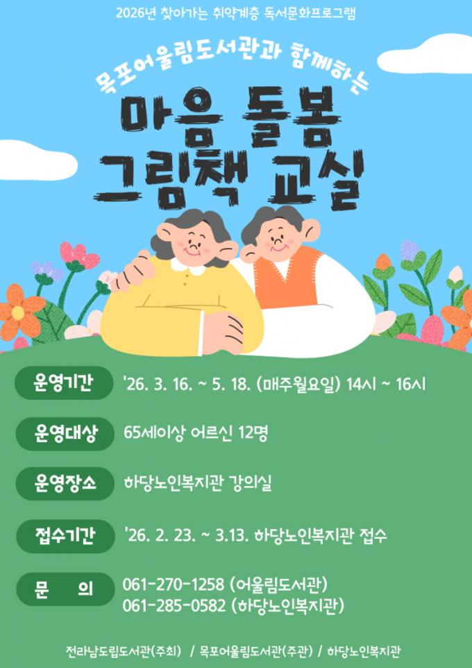 ÇÁ·Î±×·¥Àº 65¼¼ ÀÌ»ó ¾î¸£½ÅÀ» ´ë»óÀ¸·Î ¡®¸¶À½ µ¹º½ ±×¸²Ã¥ ±³½Ç¡¯À» ÁÖÁ¦·Î 3¿ù 16ÀϺÎÅÍ 5¿ù 18ÀϱîÁö 10ÁÖ°£ ÁøÇàµÈ´Ù. Âü¿©ÀÚµéÀº ±×¸²Ã¥ ÇÔ²² Àбâ¿Í ¼ÕÀ¯Èñ, Á¾ÀÌÁ¢±â, °ø¿¹, Ã¥³îÀÌ µî ´Ù¾çÇÑ µ¶ÈÄȰµ¿¿¡ Âü¿©ÇÏ°Ô µÈ´Ù.