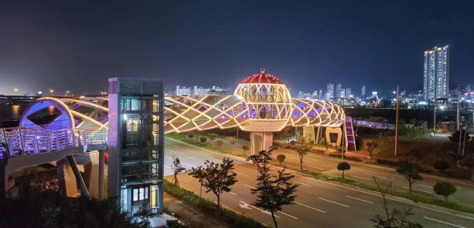 ¾Æ¿ï·¯ ¹«Áö°³´Ù¸®¿Í ÇØ¿À¸§À°±³, À̼ø½Å´ë±³´Â ÇØºñÄ¡·ÎÀÇ »ó¡Àû °æ°ü ¿ä¼Ò´Ù. ¹«Áö°³´Ù¸®´Â »ïȼ¶À» ¿¬°áÇÏ´Â º¸Çà Åë·Î·Î °ø°£ÀÇ Á¢±Ù¼ºÀ» ³ôÀ̰í, ÇØ¿À¸§À°±³´Â ³·¿¡´Â µµ½É°ú ¼öº¯À» ÀÕ´Â »ýȰÇü º¸Çà±³·Î ±â´ÉÇÏ¸ç ¾ß°£¿¡´Â Ȳ±Ýºû°ú º¸¶ùºû °æ°üÁ¶¸íÀÌ ´õÇØÁ® ¾ß°£ °æ°üÀ» ¿¬ÃâÇÑ´Ù. À̼ø½Å´ë±³´Â ±¤¾ç¸¸À» °¡·ÎÁö¸£´Â ¿õÀåÇÑ ÁÖžÀ¸·Î ÀÏ´ë ½ºÄ«À̶óÀÎÀ» Çü¼ºÇÑ´Ù.
