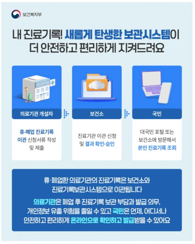 ÈÞ¡¤Æó¾÷ ÀÇ·á±â°ü Áø·á±â·Ïº¸°ü½Ã½ºÅÛÀº º´¡¤ÀÇ¿øÀÌ ¹®À» ´Ý¾Æµµ ȯÀÚÀÇ Áø·á±â·ÏÀ» ¾ÈÀüÇÏ°Ô º¸°üÇϰí, ÇÊ¿ä½Ã ¿Â¶óÀÎÀ¸·Î ¿¶÷Çϰųª »çº»À» ¹ß±Þ¹ÞÀ» ¼ö ÀÖµµ·Ï Áö¿øÇÏ´Â ¼ºñ½º´Ù. Áö³ÇØ 7¿ù 21ÀϺÎÅÍ º»°Ý ½ÃÇàµÆ´Ù.