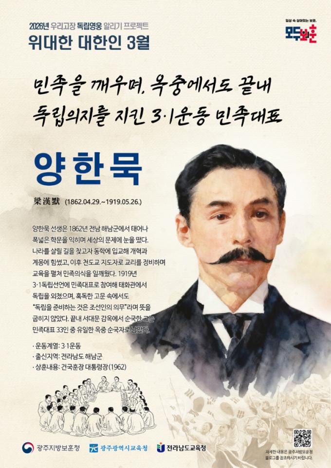 [È£³²´º½º¶óÀÎ = ¼ÀºÈ« ±âÀÚ] ±¤ÁÖÁö¹æº¸ÈÆÃ»(ûÀå Á÷¹«´ë¸® ±èÁ¾ÀÏ)Àº 2026³â 3¿ù ¡®¿ì¸®°íÀå À§´ëÇÑ ´ëÇÑÀΡ¯À¸·Î 3¡¤1¿îµ¿ ¹ÎÁ·´ëÇ¥ÀÎ ¾çÇѹ¬ ¼±»ýÀ» ¼±Á¤Çß´Ù.