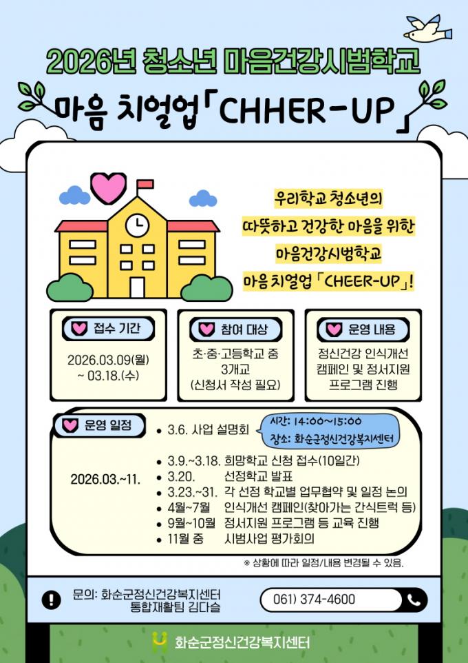 û¼Ò³â ¸¶À½°Ç°½Ã¹üÇб³ ¡®¸¶À½Ä¡¾ó¾÷(CHEER-UP)¡¯Àº ¡ã¸¶À½°Ç° ¼±º°°Ë»ç ¡ã Á¤½Å°Ç° Àνݳ¼± Ä·ÆäÀÎ ¡ãÁ¤¼Áö¿ø µî ÇÁ·Î±×·¥À» ÅëÇØ ¾Æµ¿¡¤Ã»¼Ò³âÀÇ Á¤½Å°Ç° Á¢±Ù À庮À» ³·Ãß°í, ±àÁ¤Àû ÀνÄÀ» È®»êÇϱâ À§ÇØ ÃßÁøµÇ´Â »ç¾÷ÀÌ´Ù. ¶ÇÇÑ À§Ç豺 ÇлýÀ» Á¶±â¿¡ ¹ß±¼ÇØ Ã¼°èÀûÀ¸·Î °³ÀÔÇÏ´Â °ÍÀ» ¸ñÇ¥·Î ÇÑ´Ù.