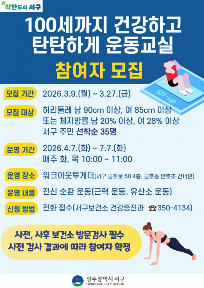 ¼±¸´Â ¿À´Â 27ÀϱîÁö Âü¿©ÀÚ 35¸íÀ» ¼±Âø¼ø ¸ðÁýÇÑ´Ù. Âü¿© ´ë»óÀº üÁö¹æ·üÀÌ ³²¼º 20%, ¿©¼º 28% ÀÌ»óÀÎ ¼±¸ ÁÖ¹ÎÀ̸ç Âü¿© Èñ¸ÁÀÚ´Â ¼±¸º¸°Ç¼Ò °Ç°ÁõÁøÆÀ(062-350-4134)À¸·Î ½ÅûÇÏ¸é µÈ´Ù.