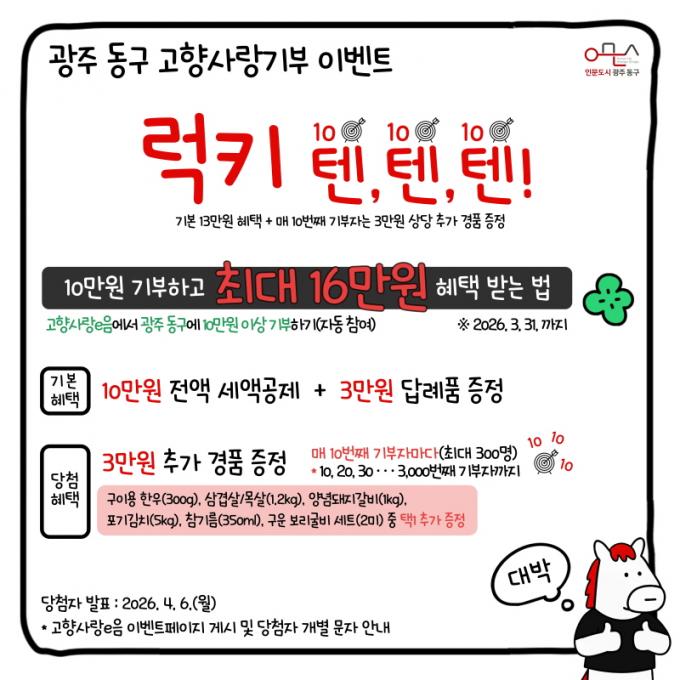 À̺¥Æ® ±â°£Àº ÀÌ´Þ 1ÀϺÎÅÍ 31ÀϱîÁöÀ̸ç, °íÇâ»ç¶û±âºÎ °ø½Ä Ç÷§Æû ¡®°íÇâ»ç¶ûeÀ½¡¯À» ÅëÇØ ±¤ÁÖ µ¿±¸¿¡ 10¸¸ ¿ø ÀÌ»ó ±âºÎÇÑ »ç¶÷À» ´ë»óÀ¸·Î ÇÑ´Ù. ´©Àû ±âºÎ ¼ø¼ ±âÁØÀ¸·Î 10¹øÂ°, 20¹øÂ°, 30¹øÂ° µî ¸Å 10¹øÂ° ±âºÎÀÚ¿¡°Ô 3¸¸ ¿ø »ó´çÀÇ ´ä·ÊǰÀ» Ãß°¡ Á¦°øÇϸç, ÃÖ´ë 3,000¹øÂ° ±âºÎÀÚ±îÁö ÃÑ 300¸íÀÌ ÇýÅÃÀ» ¹Þ°Ô µÈ´Ù.