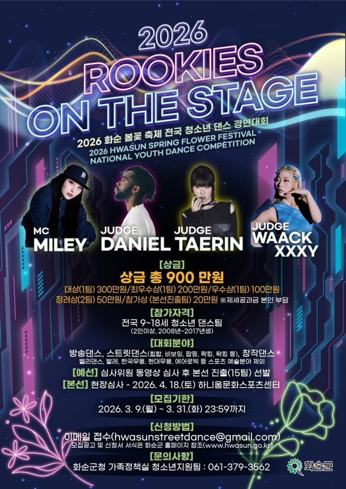 °æ¿¬ Á¾¸ñÀº ¹æ¼Û´í½º, ½ºÆ®¸®Æ®´í½º, âÀÛ´í½º Áß ÀÚÀ¯·Ó°Ô ¼±ÅÃÇÒ ¼ö ÀÖ´Ù. Á¢¼ö ±â°£Àº 2026³â 3¿ù 31ÀϱîÁöÀ̸ç, Âü°¡ ½Åû¼¿Í ´í½º µ¿¿µ»óÀ» À̸ÞÀÏ(hwasunstreetdance@gmail.com)·Î Á¦ÃâÇÏ¸é µÈ´Ù. ±âŸ ÀÚ¼¼ÇÑ »çÇ×Àº ȼø±º ȨÆäÀÌÁö °í½Ã °ø°í¶õÀ» È®ÀÎÇÏ¸é µÈ´Ù.