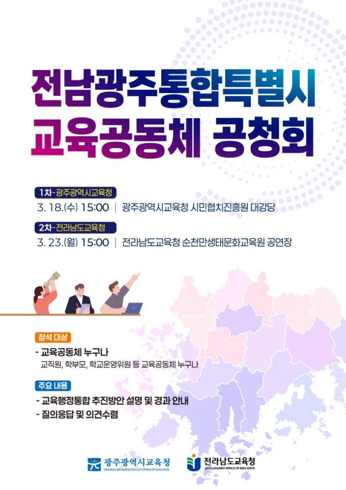 [È£³²´º½º¶óÀÎ = ¼ÀºÈ« ±âÀÚ] ±¤Áֽñ³À°Ã» ¡®±¤ÁÖÀü³²±³À°ÇàÁ¤ÅëÇսǹ«´Ü¡¯(ÀÌÇÏ ±¤ÁÖ ½Ç¹«Áغñ´Ü)°ú Àü³²µµ±³À°Ã» ¡®Àü³²±¤ÁÖ±³À°ÇàÁ¤ÅëÇÕÃßÁø´Ü¡¯(ÀÌÇÏ Àü³² ÅëÇÕÃßÁø´Ü)ÀÌ ±³À°ÅëÇÕ°ú °ü·ÃÇØ ½Ãµµ¹ÎÀÇ ÀÌÇØ¸¦ µ½±â À§ÇØ ¡®Àü³²±¤ÁÖÅëÇÕÆ¯º°½Ã ±³À°°øµ¿Ã¼ °øÃ»È¸¡¯¸¦ °³ÃÖÇÑ´Ù.