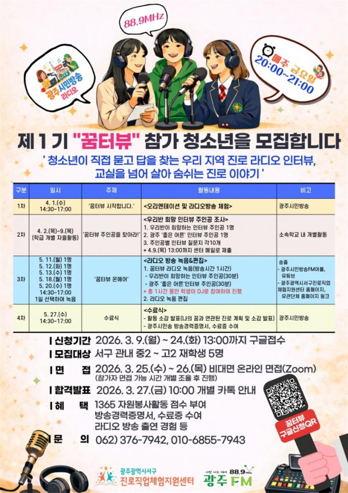 ƯÈ÷ Áö¿ª ¹æ¼Û»ç¿Í Çù·ÂÇØ ÁøÇàµÇ´Â À̹ø ÇÁ·Î±×·¥Àº û¼Ò³âµéÀÌ ½ÇÁ¦ ¹æ¼Û Á¦ÀÛ È¯°æÀ» °æÇèÇϸç ÀÎÅÍºä ±âȹ, Áú¹® ¼³°è, ¼ÒÅë ´É·Â µîÀ» ÇÔ²² Ű¿ï ¼ö ÀÖ´Â °ÍÀÌ Æ¯Â¡ÀÌ´Ù. ÇÁ·Î±×·¥ Âü¿© Çлý¿¡°Ô´Â ¹æ¼Û Ã⿬ °æÇè°ú ÇÔ²² ¹æ¼Û°æ·ÂÁõ¸í¼, ¼ö·áÁõ ¹× ÀÚ¿øºÀ»ç Ȱµ¿ ½Ã°£ÀÌ Á¦°øµÈ´Ù.