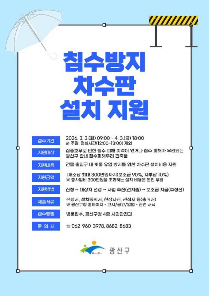 [È£³²´º½º¶óÀÎ = ¼ÀºÈ« ±âÀÚ] ±¤ÁÖ ±¤»ê±¸°¡ ÁýÁßÈ£¿ì·Î ÀÎÇÑ Ä§¼ö ÇÇÇØ ¿¹¹æÀ» À§ÇØ ¡®2026³â ±¤»ê±¸ ħ¼ö¹æÁö Â÷¼öÆÇ ¼³Ä¡ Áö¿ø»ç¾÷¡¯À» ÃßÁøÇÑ´Ù.