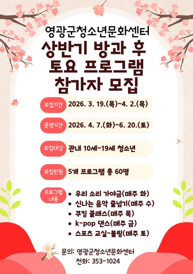 [È£³²´º½º¶óÀÎ = ¼ÀºÈ« ±âÀÚ] ¿µ±¤±ºÃ»¼Ò³â¹®È¼¾ÅÍ´Â Áö¿ª û¼Ò³âµéÀÇ °ÇÀüÇÑ ¿©°¡ Ȱµ¿ Áö¿ø°ú ÀÚ±â°è¹ß ±âȸ Á¦°øÀ» À§ÇØ ¡®2026³â »ó¹Ý±â ¹æ°ú ÈÄ ¹× Åä¿ä ÇÁ·Î±×·¥¡¯ Âü°¡ÀÚ¸¦ ¸ðÁýÇÑ´Ù°í ¹àÇû´Ù.