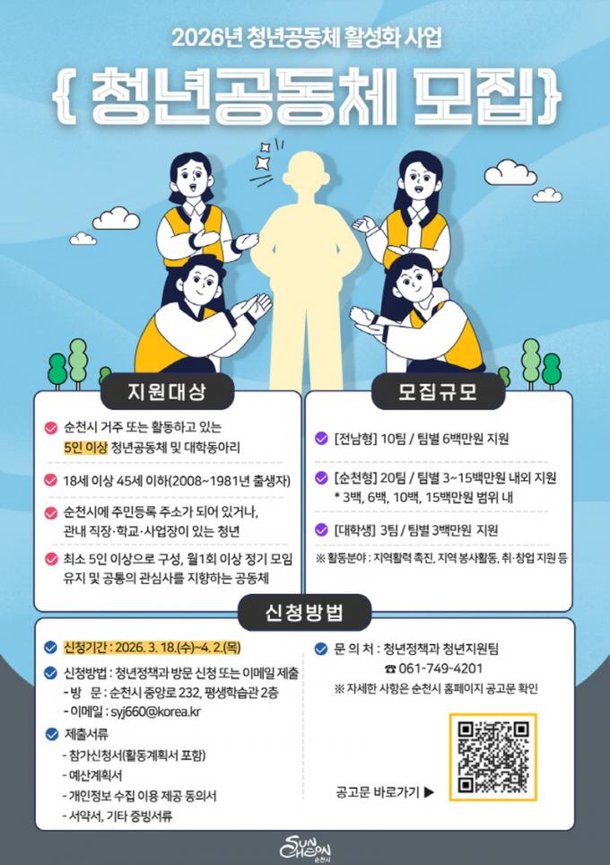 [È£³²´º½º¶óÀÎ = ¼ÀºÈ« ±âÀÚ] ¼øÃµ½Ã´Â û³âµéÀÇ ¾ÆÀ̵ð¾î¿Í ÄÜÅÙÃ÷·Î Áö¿ª ³»¿¡¼ ÆîÄ¡´Â ´Ù¾çÇÑ È°µ¿À» Áö¿øÇÏ´Â 2026³â 「û³â°øµ¿Ã¼ Ȱ¼ºÈ »ç¾÷」ÀÇ Âü¿© °øµ¿Ã¼¸¦ ¸ðÁýÇÑ´Ù°í ¹àÇû´Ù.