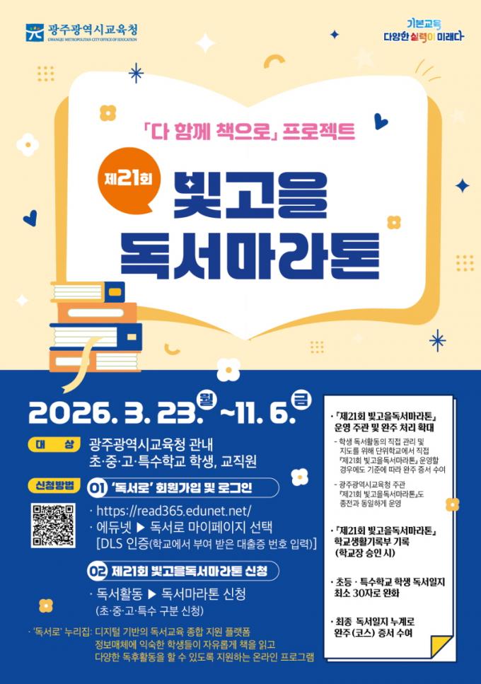[È£³²´º½º¶óÀÎ = ¼ÀºÈ« ±âÀÚ] ±¤Áֽñ³À°Ã»(±³À°°¨ ÀÌÁ¤¼±)Àº ¡®´Ù ÇÔ²² Ã¥À¸·Î¡¯ ÇÁ·ÎÁ§Æ® ½Çõ°ú ¸ÅÀÏ µ¶¼ÇÏ´Â Çб³ ¹®È¸¦ Á¶¼ºÇϱâ À§ÇØ ¿À´Â 11¿ù 6ÀϱîÁö ¡®Á¦21ȸ ºû°íÀ»µ¶¼¸¶¶óÅæ¡¯À» ¿î¿µÇÑ´Ù.