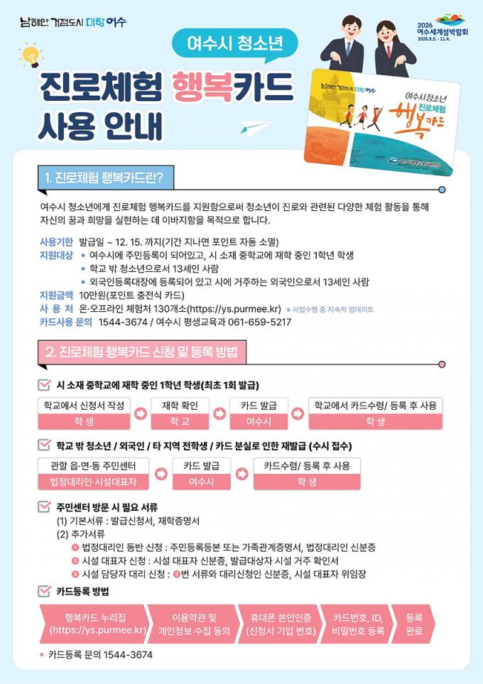 À̹ø »ç¾÷Àº ¿©¼ö½Ã¿¡ °ÅÁÖÇÏ´Â ÁßÇб³ 1Çгâ ÀçÇлý°ú 13¼¼ Çб³ ¹Û û¼Ò³âÀ» ´ë»óÀ¸·Î, 1ÀÎ´ç ¿¬°£ 10¸¸ ¿øÀ» ÃæÀü½Ä Æ÷ÀÎÆ® Ä«µå ÇüÅ·ΠÁö¿øÇÑ´Ù.