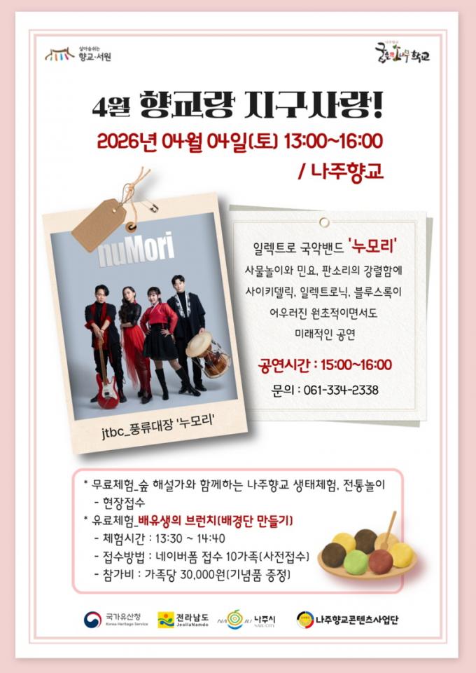 ÇÑÆí ¡®³ªÁÖÇâ±³ ±ÁÀº ¼Ò³ª¹«Çб³¡¯´Â ±¹°¡À¯»êû°ú Àü¶ó³²µµ, ³ªÁֽð¡ ÁÖÃÖÇÏ°í ³ªÁÖÇâ±³ÄÜÅÙÃ÷»ç¾÷´ÜÀÌ À§Å¹¹Þ¾Æ ¿î¿µÇÏ´Â Áö¿ª ¹®ÈÀ¯»ê Ȱ¿ë»ç¾÷À¸·Î 4¿ùºÎÅÍ 11¿ù±îÁö üÇè°ú °ø¿¬, ¼÷¹ÚÇü ÇÁ·Î±×·¥ µî ´Ù¾çÇÑ ÄÜÅÙÃ÷¸¦ ¼±º¸ÀÏ °èȹÀÌ´Ù.