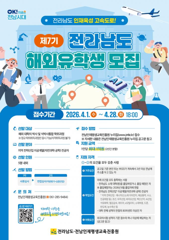 [È£³²´º½º¶óÀÎ = ¼ÀºÈ« ±âÀÚ] Àü¶ó³²µµ¿Í Àü³²ÀÎÀçÆò»ý±³À°ÁøÈï¿øÀº ±Û·Î¹ú ÇÙ½É ÀÎÀç À°¼ºÀ» À§ÇØ ¼¼°è ¸í¹®´ë À¯ÇÐ ±âȸ¸¦ Á¦°øÇÏ´Â ¡®Á¦7±â Àü¶ó³²µµ ÇØ¿ÜÀ¯Çлý¡¯À» ¿À´Â 28ÀϱîÁö ¸ðÁýÇÑ´Ù°í ¹àÇû´Ù.