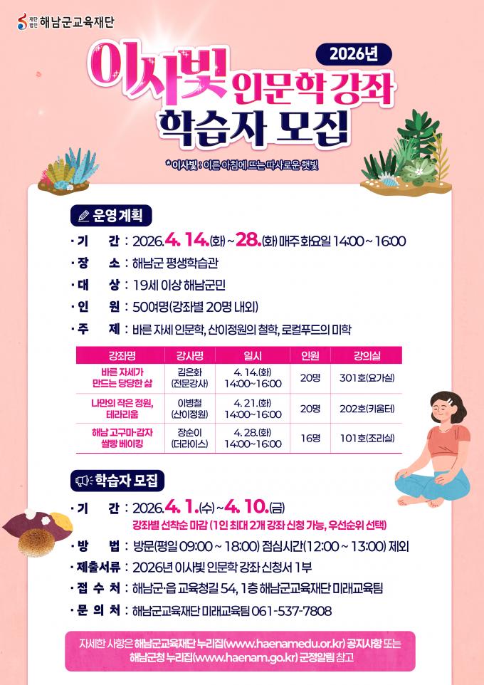 [È£³²´º½º¶óÀÎ = ¼ÀºÈ« ±âÀÚ] ÇØ³²±º±³À°Àç´ÜÀº 4¿ù 14ÀϺÎÅÍ 28ÀϱîÁö¡®Çس² ÀÌ»çºû Àι®ÇÐ °Á¡¯¸¦ ¿î¿µÇÑ´Ù. ¡®ÀÌ»çºû¡¯Àº ¡®À̸¥ ¾ÆÄ§ µû½ºÇÏ°Ô ºñÃß´Â ÇÞºû¡¯À» ÀǹÌÇÏ¸ç µû¶æÇϰí Ä£±ÙÇÑ Àι®ÇÐÀÇ ºûÀ» ÀüÇÏ´Â ±º¹Î ±³À°°úÁ¤ÀÌ´Ù.
